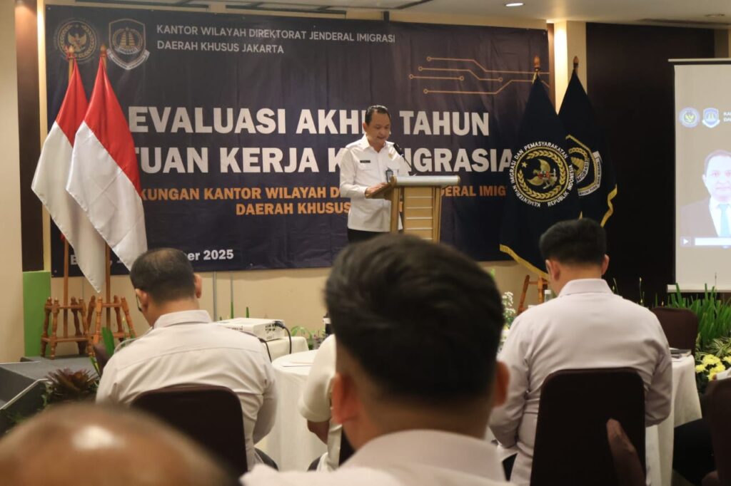 Bogor-Kantor Wilayah Direktorat Jenderal Imigrasi Daerah Khusus Jakarta menyelenggarakan Evaluasi Akhir Tahun Satuan Kerja Keimigrasian yang diikuti seluruh unit pelaksana teknis di lingkungan Kanwil. Kegiatan yang berlangsung di Hotel Santika Bogor Rabu,10 Desember 2025 ini menjadi agenda strategis dalam memastikan keberlanjutan peningkatan kinerja, efektivitas pelaksanaan tugas, serta kualitas layanan keimigrasian.